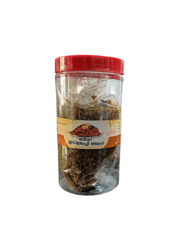 FryLolu’s Beef Ediyirachi Fry (often labeled as Beef Idiyirachi Fry) is a traditional South Indian delicacy prepared from sun-dried, pounded, and stir-fried beef. The process imparts a rich, smoky flavor combined with spicy, aromatic notes from ingredients such as chili, turmeric, garam masala, coriander powder, garlic, and curry leaves, all fried in coconut oil for authentic Kerala taste.